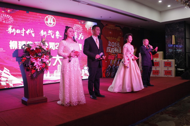 2018年1月26日,大唐嘉宴一樓大廳燈光明亮,前來參加集團公司2017年度表彰會的員工和嘉賓徐徐入場。簽到處,呈現(xiàn)出難得一見排長隊的情景,參會者通過掃描微信二維碼獲取抽獎資格,領(lǐng)上一份公司派送的“福袋” 興高采烈的入座到指定座位……會場舞臺的LED大屏幕,顯示紅色主調(diào)“柳建集團公司2017年度表彰大會”主題背景,兩旁2018戊戌年大吉的圖案讓會場增添許多節(jié)日的氛圍。