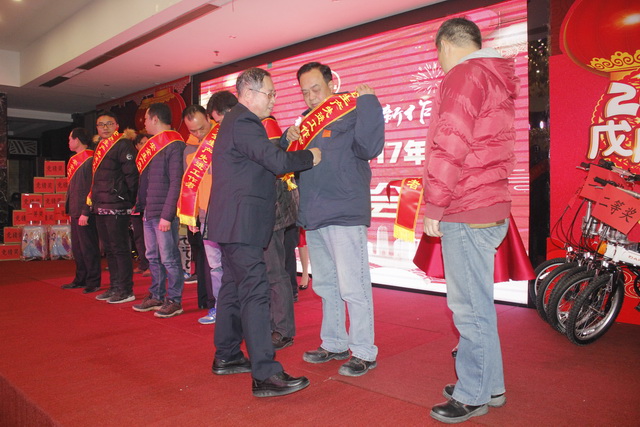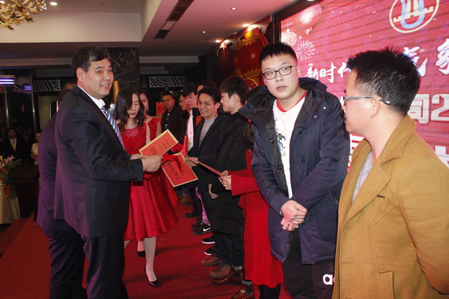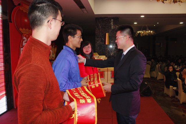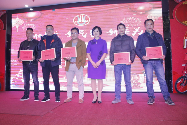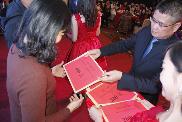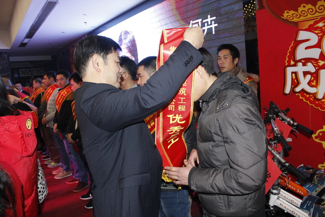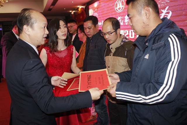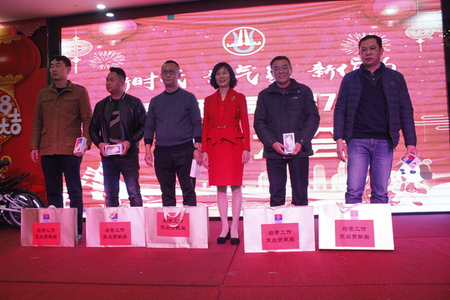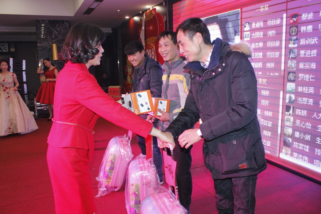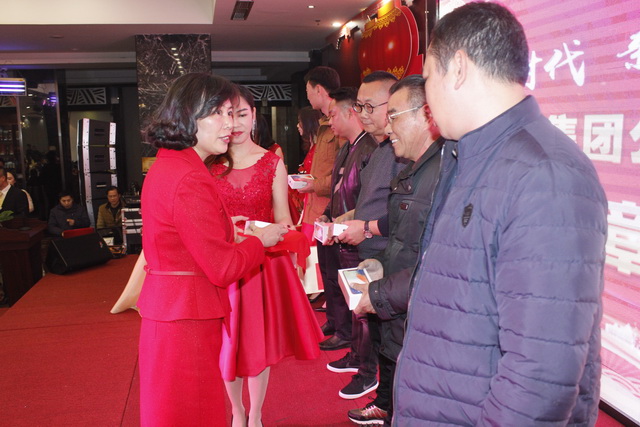 頒獎進行最后環(huán)節(jié),五位在2017年做出突出貢獻的經(jīng)濟責任人,隨著陣陣的掌聲走上舞臺,獲得由集團公司董事長鐘麗清頒發(fā)的實物獎品。表彰大會在莊重熱烈的氣氛中降下帷幕。祥和同樂的晚宴在舉杯共飲的祝福下開場……